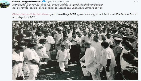 ఎన్టీఆర్ చిత్ర దర్శకుడు క్రిష్ జాగర్లమూడి హరికృష్ణ మరణంపై దిగ్బ్రంతి వ్యక్తం చేశారు. తండ్రికి తగిన తనయుడని, చిన్న వయసులోనే తండ్రి ముందు నడిచిన మంచి మనసు ఆయనదని అభివర్ణించారు క్రిష్. 1962లో ఎన్టీఆర్ నేషనల్ డిఫెన్స్ ఫండ్ కలెక్షన్ లో నందమూరి తారకరామారావుతో అడుగులు వేస్తున్న చిన్ని హరికృష్ణ ఫొటో ను ట్వీట్ చేశారు క్రిష్. మార్పుకోసం రామ రధ చక్రాలు నడిపిన చైతన్యరధసారధ్యం, చిన్ననాటే జనం కోసం తండ్రి ముందు నడచిన వారసత్వం అంటూ హరికృష్ణ చిన్ననాటి జ్ఞాపకాలను అభిమానులముందుంచారు క్రిష్.