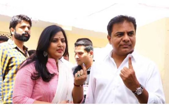 తెరాస కార్యనిర్వాహక అధ్యక్షుడు కేటీఆర్ ఓటు హక్కు వినియోగించుకున్నారు. బంజారాహిల్స్ నందినగర్లో తన సతీమణితో కలిసి వచ్చి ఓటు వేశారు. కేటీఆర్ సోదరి, ఎంపీ అభ్యర్థి కవిత తన ఓటు హక్కును వినియోగించుకున్నారు. కుటుంబ సభ్యులతో కలిసి వచ్చిన ఆమె పొతంగల్లో ఓటు వేశారు.