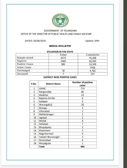 తెలంగాణలో ఒక్కరోజే 985 కొత్త కేసులు