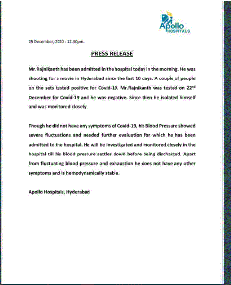 సూపర్ స్టార్ రజనీకాంత్ అనారోగ్యంతో హైదరాబాద్ అపోలో హాస్పటల్ లో చేరారు. ఈ విషయాన్ని తెలియజేస్తూ అపోలో ఆసుపత్రి యాజమాన్యం ఓ ప్రెస్ నోట్ రిలీజ్ చేసింది. గత పదిరోజులుగా అన్నాత్తె షూటింగ్ లో హైదరాబాద్ లోనే ఉన్నారు రజనీ. ఈ సినిమా చిత్రబృందంలోని పలువురికి కరోనా పాజిటివ్ రావడంతో షూటింగ్ ని వాయిదా వేశారు. ఈ నెల 22న రజనీకి కరోనా టెస్ట్ చేయగా.. నెగటివ్ వచ్చింది. అయినా.. ఆయన హోంక్వారంటైన్ లోనే ఉంటున్నారు. అయితే హోంక్వారంటైన్ లో ఉన్న రజనీ బ్లెడ్ ప్రెషన్స్ సమస్యతో ఈ ఉదయం అపోలో ఆసుపత్రిలో చేరారు. ఈ మేరకు ఆసుపత్రి యాజమాన్యం ప్రెస్ నోట్ ని రిలీజ్ చేసింది.